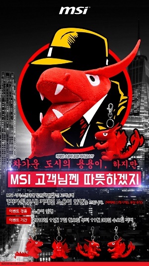 MSI코리아는 자사 메인보드와 그래픽카드 통합 서비스센터인 CS이노베이션에 방문하거나 택배 서비스를 이용하는 고객들을 대상으로 마스코트인 ‘용용이 인형’을 증정하는 이벤트를 이달 30일까지 진행한다고 7일 밝혔다.