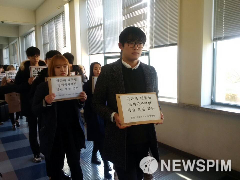 [뉴스핌=이성웅 기자·정세희 수습기자] 서강대학교 학생들이 박근혜 대통령의 명예박사 학위를 박탈할 것을 학교 측에 정식으로 요구하고 나섰다.