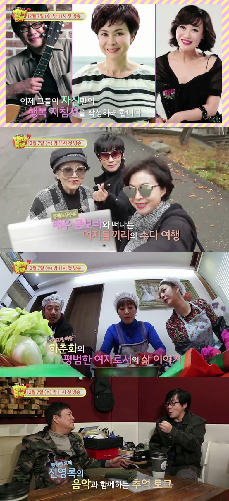 금보라는 김영옥 등 여자끼리 수다 여행을 떠나고, 하춘화는 배기성 등과 함께 김장을 담그며 평범한 여자로서의 삶 이야기를 전한다. 전영록은 남진과 함께 길거리 버스킹을 나설 예정이라 기대감을 모은다.
