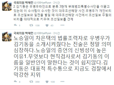 백 의원은 22일 저녁 자신의 트위터에 "노승일이 차은택의 법률조력자로 우병우가 김기동을 소개시켜줬다는 진술은 정말 의미심장하다"라며 글을 시작했다.