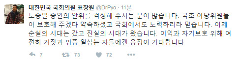 이어 표창원 의원은 "이제 최순실의 시대는 갔고 진실의 시대가 왔습니다. 이익과 자기보호 위해 여전히 거짓과 위증 일삼는 자들에겐 응징이 기다립니다"라며 희망 가득한 자신의 생각을 전했다.