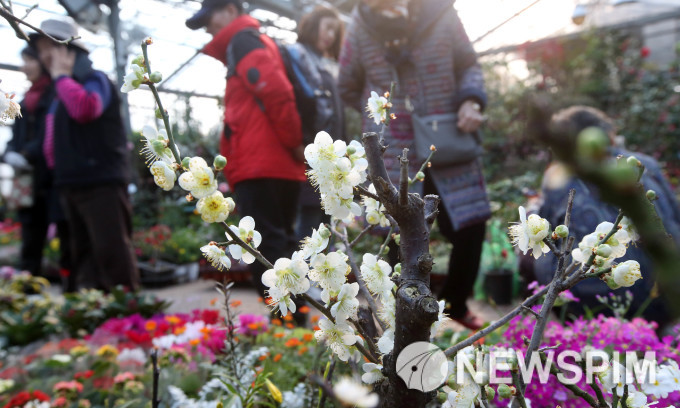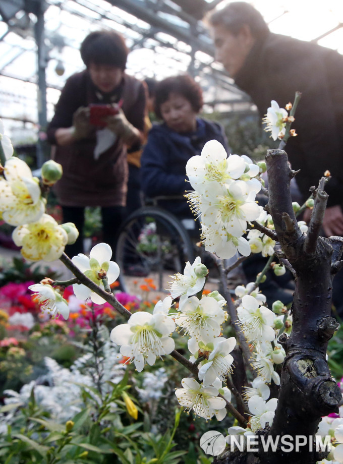 [뉴스핌=김학선 기자] 입춘(立春)을 하루 앞둔 3일 오후 서울 서초구 양재꽃시장에서 겨울잠을 깬 '백매화' 뒤로 봄꽃을 사려는 시민들이 분주하다.