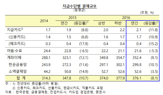 특히 신용카드의 경우 2015년 중 전년 대비 6.8% 증가한 것에 이어 2016년 중에는 10.9% 증가해 일평균 결제규모가 대폭 늘어났다. 한은 측은 “항공사, 유통업체, 의료기관, 대중교통 등에서 개인의 신용카드 이용이 확산됐다”고 설명했다.