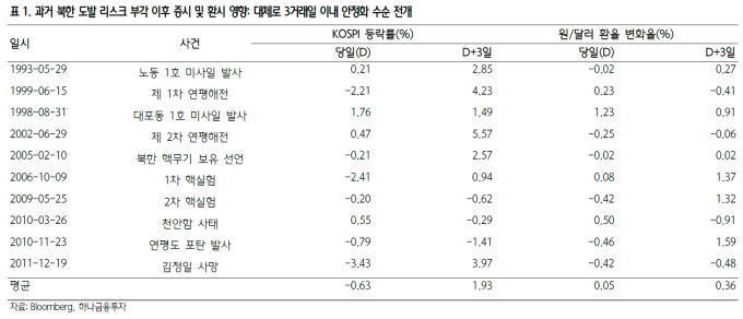 김용구 연구원은 11일 “1993년 노동 1호 미사일 발사부터 2011년 김정일 사망까지 과거 10차례 주요 북한 무력도발 당시 증시엔 대체로 영향이 미미했고 외환시장에선 소폭의 원·달러 환율 상승이 나타났다”며 “그러나 3거래일 이내 안정화 수순에 접어들었다. 주식시장의 차분한 반응은 다소 의외일 수 있겠는데 한반도 지정학적 리스크는 코리아 디스카운트라는 이름으로 이미 증시 전반에 반영된 재료라는 점을 고려할 필요가 있다”고 평가했다.