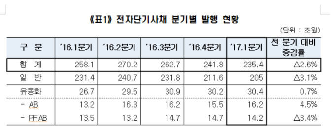 1분기 전자단기사채 235조 발행...전분기 比 2.6%↓