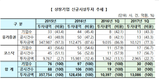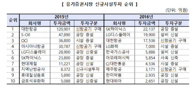 유가증권시장에서 신규시설투자 상위기업은 2조2137억원을 공시한 SK하이닉스가 1위를 차지했다. 이어 LG디스플레이가 1조9900억으로 2위, 대한항공이 1조7536억원으로 3위를 차지했다.