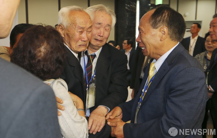 [금강산=뉴스핌] 사진공동취재단 = 제21차 이산가족 상봉행사 2회차 첫날인 24일 오후 북한 금강산 이산가족면회소에서 열린 단체상봉에서 북측에서 온 아버지 조덕용(88,왼쪽) 할아버지와 남측 동생 조상용(80,가운데), 아들 조정기(67,오른쪽)씨를 얼싸안고 오열하고 있다. 2018.08.24