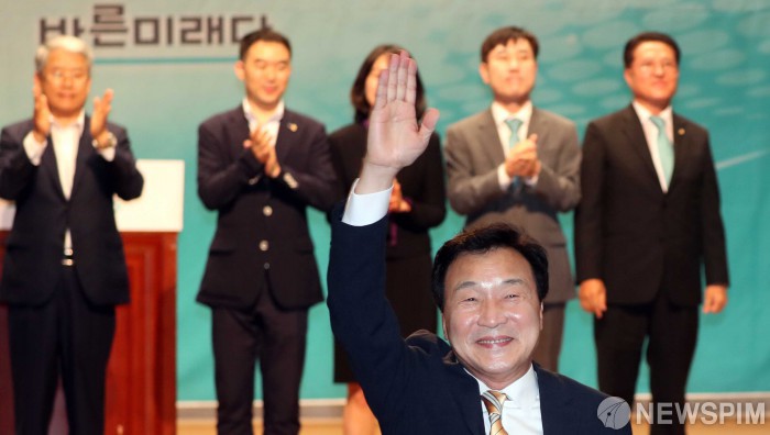 [서울=뉴스핌] 김학선 기자 = 2일 오후 서울 여의도 국회 의원회관 대회의실에서 열린 바른미래당 당대표 및 최고위원 및 전국청년위원장 선출대회에서 손학규 후보가 당원들에게 손을 흔들고 있다. 2018.09.02 yooksa@newspim.com