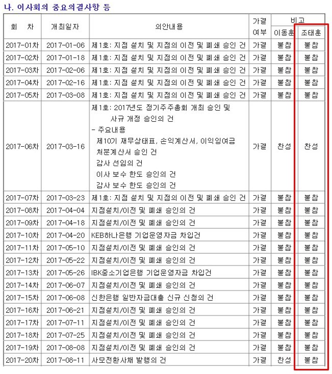 지난해의 경우 조태훈 사외이사는 1월 1일부터 8월 19일 사임하기 전까지 모두 20차례 열린 이사회에서 단지 1차례 참석했다. 조태훈 사외이사가 참석한 이사회는 지난해 3월 16일 개최된 정기 주주총회가 유일했고, 이날 모든 안건에 찬성했다.