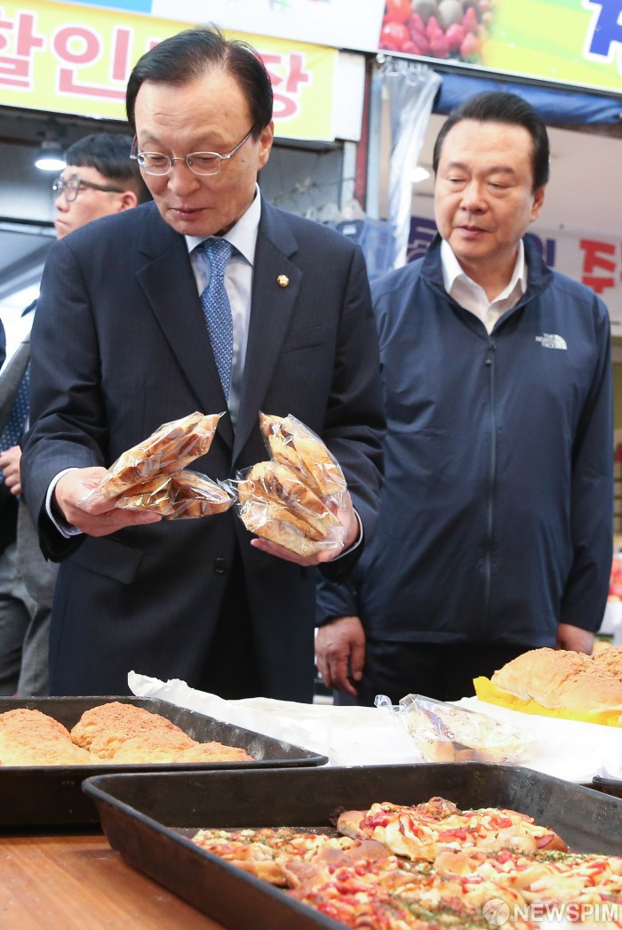 | [서울=뉴스핌] 최상수 기자 = 이해찬 더불어민주당 대표가 17일 오전 서울 강서구 남부시장을 방문해 빵을 구매하고 있다. 2018.09.17 kilroy023@newspim.com |