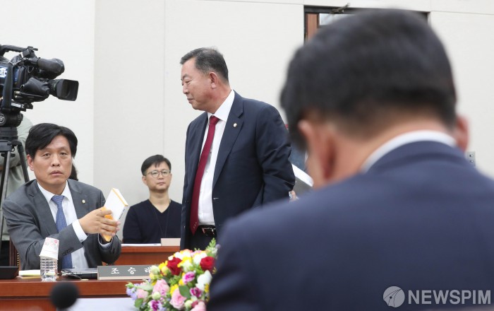 [서울=뉴스핌] 김학선 기자 = 1일 오후 국회에서 속개된 교육위원회 전체회의에서 더불어민주당 간사인 조승래 의원이 이찬열 위원장과 대화를 나누던 중 자유한국당 간사인 김한표 의원을 바라보고 있다. 이날 회의는 유은혜 교육부 장관 후보자 청문보고서 채택과 관련해 여야 간사 협의를 진행하기 위해 정회됐다. 2018.10.01 yooksa@newspim.com