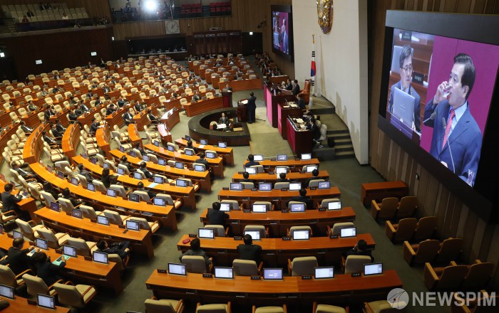 [서울=뉴스핌] 김학선 기자 = 심재철 자유한국당 의원이 2일 국회 본회의장에서 열린 경제분야 대정부질문에서 자신을 고발한 김동연 부총리 겸 기획재정부 장관에게 질문 도중 물을 마시고 있다. 2018.10.02 yooksa@newspim.com