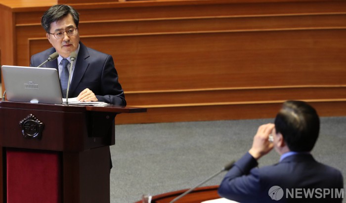 [서울=뉴스핌] 김학선 기자 = 심재철 자유한국당 의원이 2일 국회 본회의장에서 열린 경제분야 대정부질문에서 자신을 고발한 김동연 부총리 겸 기획재정부 장관에게 질문 도중 물을 마시고 있다. 2018.10.02 yooksa@newspim.com