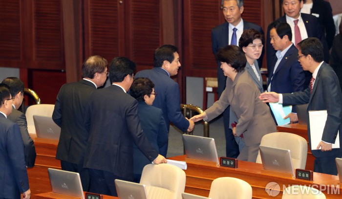 [서울=뉴스핌] 김학선 기자 = 심재철 자유한국당 의원이 2일 국회 본회의장에서 경제분야 대정부질문을 마치고 동료의원들과 인사를 나누고 있다. 2018.10.02 yooksa@newspim.com