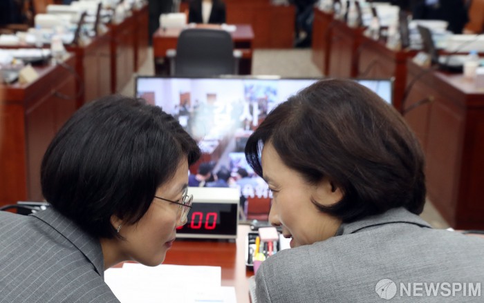 [서울=뉴스핌] 김학선 기자 = 유은혜 사회부총리 겸 교육부 장관이 11일 국회에서 열린 교육위원회의 교육부 등에 대한 국정감사가 중지되자 박춘란 교육부 차관과 대화를 나누고 있다. 2018.10.11 yooksa@newspim.com