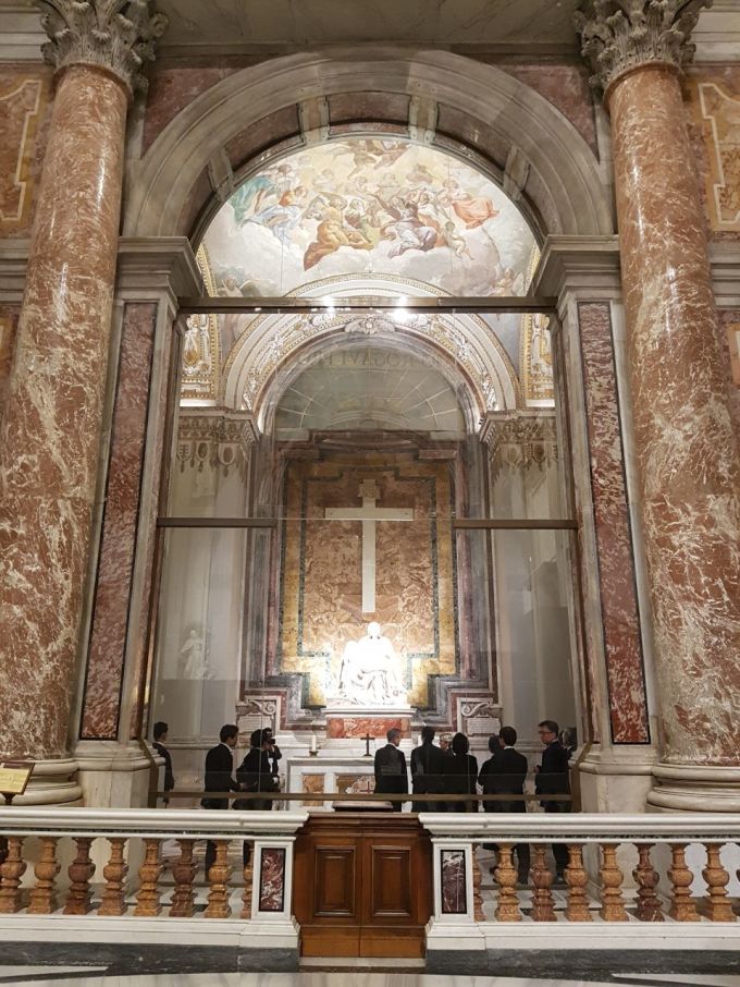 바티칸 성 베드로 성당의 피에타. 미켈란젤로의 작품으로 1972년에 괴한의 습격으로 성모의 코 부분 등 일부가 파손된 후 유리문으로 보호됐다. 바티칸의 배려로 문재인 대통령은 유리문 안에 들어가서 관람할 수 있었다.