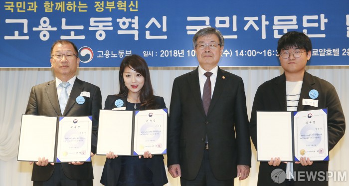 [서울=뉴스핌] 이형석 기자 = 이재갑 고용노동부 장관과 분야별 대표 국민자문단이 24일 오후 서울 중구 로얄호텔에서 열린 고용노동혁신 국민자문단 발대식에서 기념촬영을 하고 있다. 2018.10.24 leehs@newspim.com