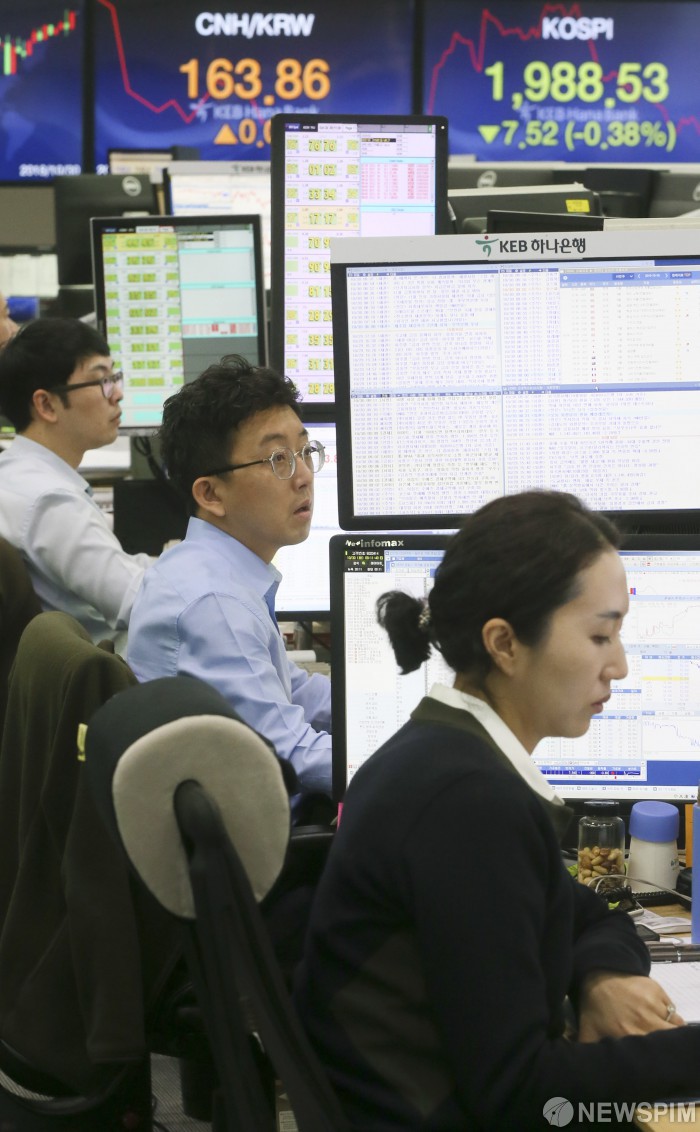 [서울=뉴스핌] 이형석 기자 = 2000선이 무너진 코스피 지수가 엿새째 하락을 기록하고 있다. 30일 전일 대비 2.39포인트 내린 1,993.66에 장을 시작한 코스피는 이후 보합권에서 등락을 반복하고 있다. 이날 서울 명동 KEB하나은행 딜링룸에서 외환딜러들이 업무를 보고 있다. 2018.10.30 leehs@newspim.com