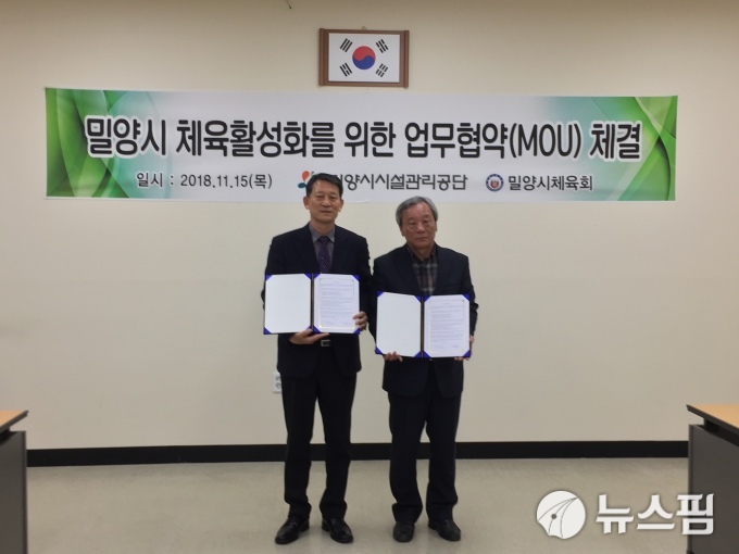 [밀양=뉴스핌] 남경문 기자 = 밀양시시설관리공단은 15일 공단 회의실에서 밀양시체육회와 밀양시 체육활성화를 위한 업무협약을 체결했다.