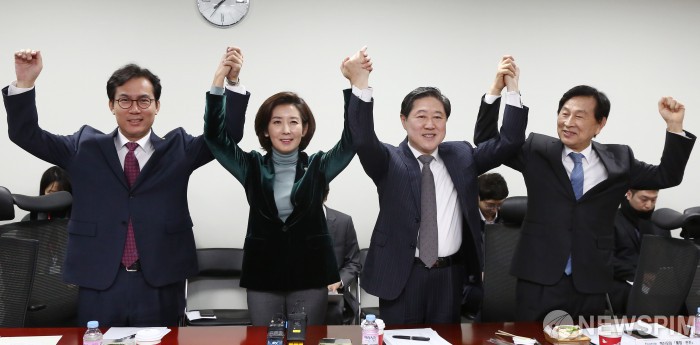 [서울=뉴스핌] 김학선 기자 = 자유한국당 원내대표 후보자인 김영우(왼쪽부터), 나경원, 유기준, 유재중 의원이 22일 국회 의원회관에서 열린 혁신모임 '통합-전진' 10차 회의에 참석해 손을 잡고 있다. 2018.11.22 yooksa@newspim.com