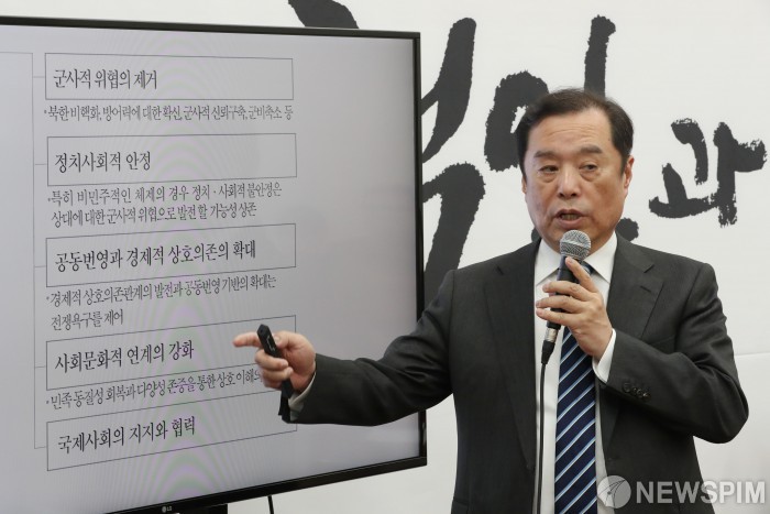 [서울=뉴스핌] 김학선 기자 = 김병준 자유한국당 비상대책위원장이 13일 국회에서 평화이니셔티브 관련 기자간담회를 하고 있다. 2018.12.13 yooksa@newspim.com