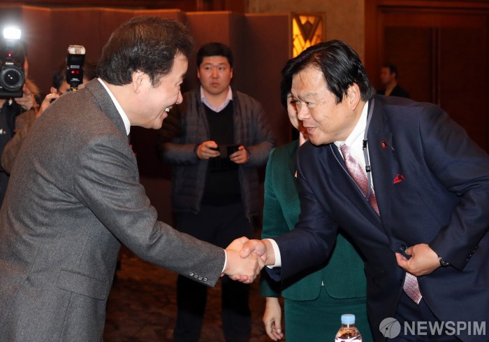 [서울=뉴스핌] 정일구 기자 = 이낙연 국무총리가 14일 서울 중구 소공동 롯데호텔에서 열린 한일-일한의원연맹 총회에 참석해 일본 의원과 악수를 하고 있다. 2018.12.14 mironj19@newspim.com