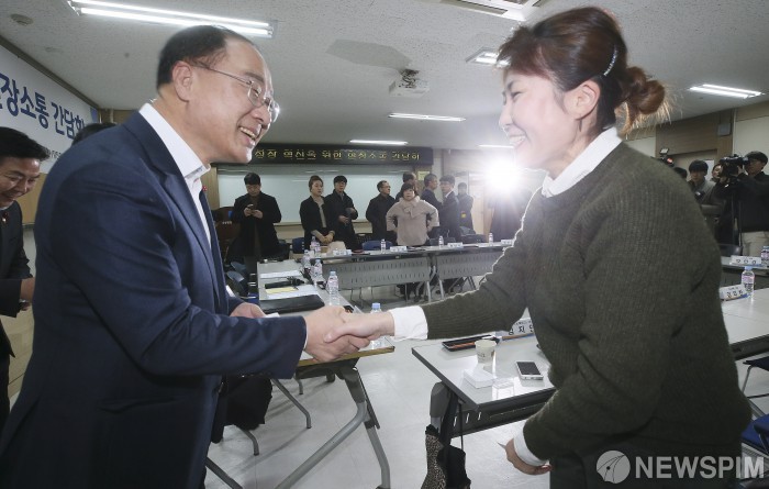 [서울=뉴스핌] 이형석 기자 = 홍남기 부총리 겸 기획재정부 장관이 20일 오전 서울 종로구 소상공인진흥재단 서울전용교육장에서 열린 자영업 성장‧혁신을 위한 현장소통 간담회에서 소상공인과 악수를 하고 있다. 2018.12.20 leehs@newspim.com