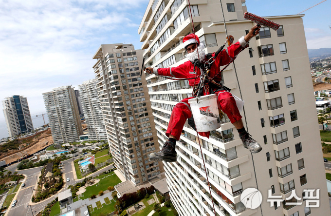 | [콘콘 로이터=뉴스핌] 정윤영 인턴기자 = 22일(현지시각) 칠레 콘콘에서 산타로 분장한 외벽청소자 한 명이 창문을 닦으며 포즈를 취하고 있다. 2018.12.22. |