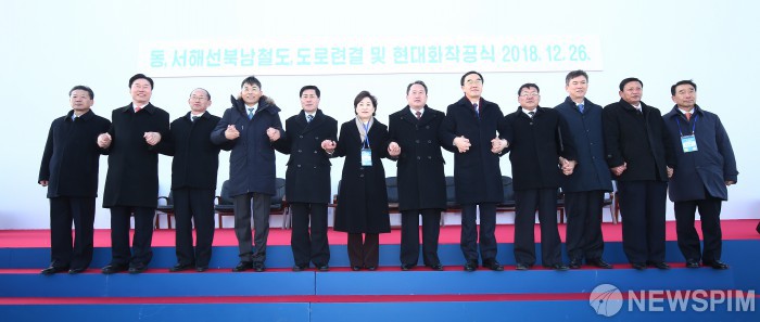[판문역=뉴스핌] 사진공동취재단 = 26일 북측 개성 판문역에서 남북 철도·도로 연결 및 현대화 착공식을 마치고 김현미 국토교통부 장관 조명균 통일부 장관과 리선권 조국평화통일위원회 및 남북측 참가자들이 기념사진을 찍고 있다. 2018.12.26