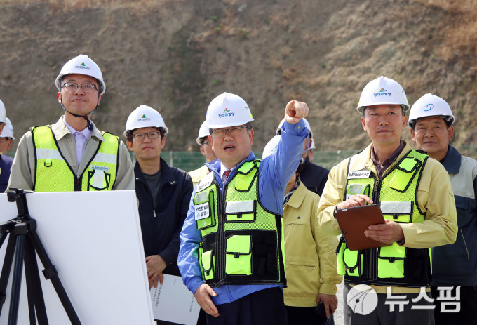 | 박일호 밀양시장(오른쪽 두 번째)이 지난 4월 ‘국가안전대진단’ 기간을 맞아 하남일반산업단지 공사 현장 안전점검을 하고 있다.[사진=밀양시]2018.12.29. |