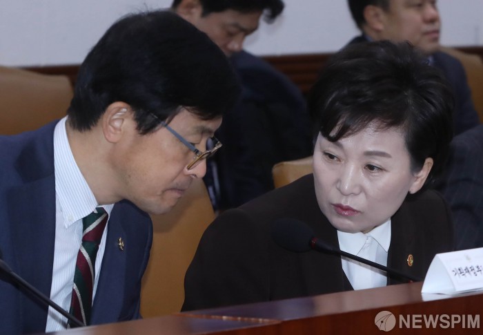[서울=뉴스핌] 윤창빈 수습기자 = 김현미 국토교통부장관(오른쪽) 10일 오전 서울 종로구 정부서울청사에서 열린 ‘국정현안점검조정회의’에서 회의 전 대화를 나누고 있다. 2019.01.10 pangbin@newspim.com
