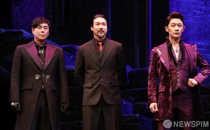 [서울=뉴스핌] 정일구 기자 = 배우 김법래(왼쪽부터), 신성우, 서영주가 31일 오후 서울 송파구 올림픽공원 우리금융아트홀에서 열린 뮤지컬 '잭더리퍼' 10주년 기념 프레스콜에서 포즈를 취하고 있다. 2019.01.31 mironj19@newspim.com