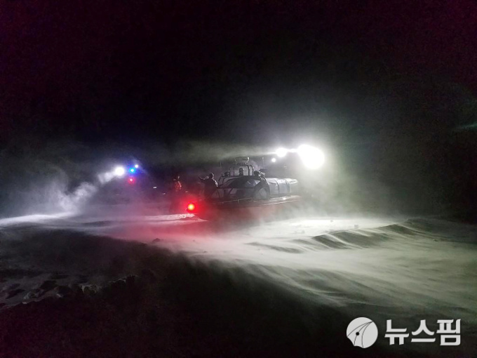 [스터전베이 로이터=뉴스핌] 정윤영 인턴기자 = 북극의 찬 기류 '극소용돌이(polar vortex)'로 미국 중북부에 한파가 불어 닥쳐 기온이 영하 20도(체감 온도 영하 34도)까지 떨어진 31일(현지시각) 미국 위스콘신주(州) 스터전베이 부근 해변에서 미국 해안경비대(USCG) 소속 경비대원과 천연자원당국(DNR) 크루가 7명의 어부를 구조해 수상 비행기에 태우고 있다. 2019.01.31.