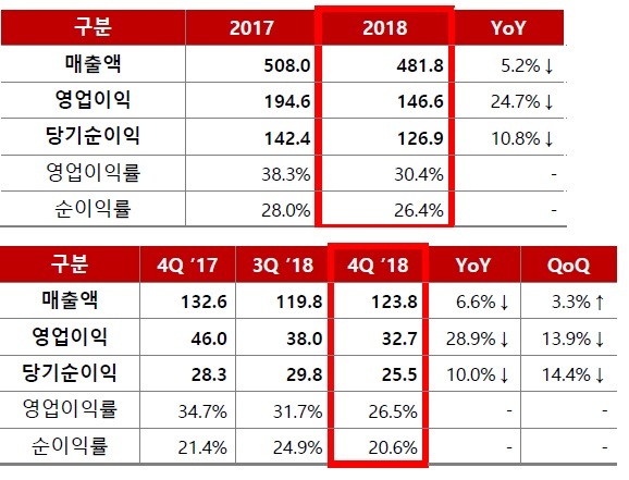 4분기 실적은 매출 1238억원, 영업이익 327억원, 당기순이익 255억원이다. 전년동기 대비 매출과 영업이익은 각각 6.6%, 28.9% 줄었고 당기순이익도 14.4% 감소했다.