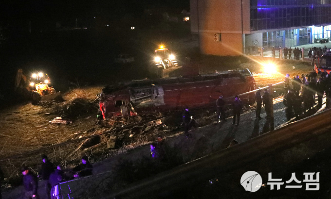 | [스코페 로이터=뉴스핌] 정윤영 인턴기자 = 13일(현지시각) 마케도니아 스코페에서 버스 전복사고가 발생한 가운데 구조대원들이 현장에서 구조작업을 벌이고 있다. 2019.02.13. |