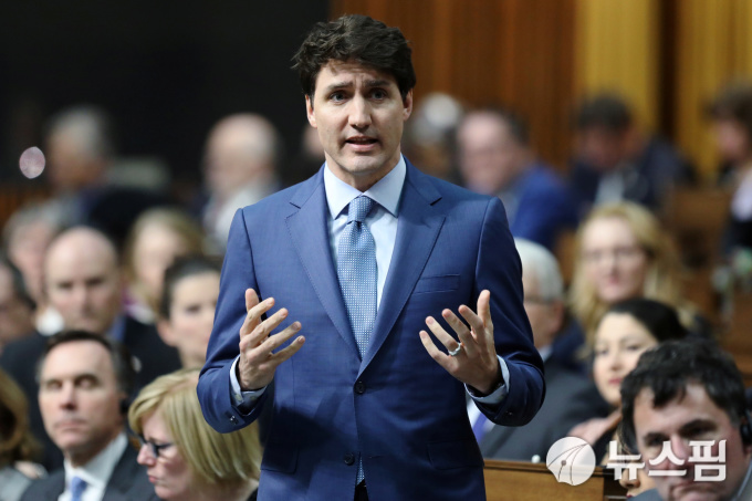 | [오타와 로이터=뉴스핌] 남혜경 인턴기자 = 저스틴 트뤼도 캐나다 총리가 팔러먼트힐 웨스트블록 건물 임시 장소에서 진행한 하원 '질의 시간'(부처 장관들에 대한 의원들의 질의 응답 시간) 중 발언하고 있다. 2019.02.25. |