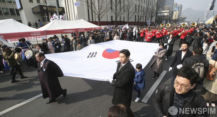 [서울=뉴스핌] 이형석 기자 = 1일 오후 서울시청 인근에서 시민들이 3·1절 100주년을 기념 하며 고종 장례행렬 재현 및 만세 행진을 하고 있다. 2019.03.01 leehs@newspim.com