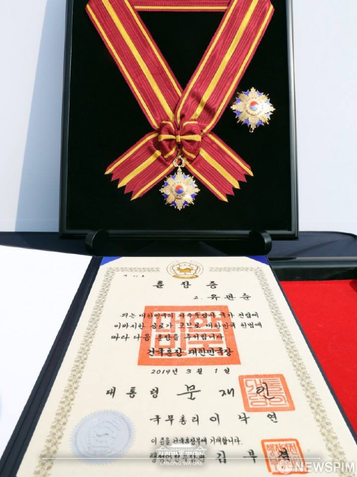 [서울=뉴스핌] 1일 오전 서울 광화문광장에서 열린 제100주년 3.1절 기념식에서 故 유관순 독립유공자에게 서훈된 건국훈장 대한민국장 [사진=청와대페이스북].2019.03.01.