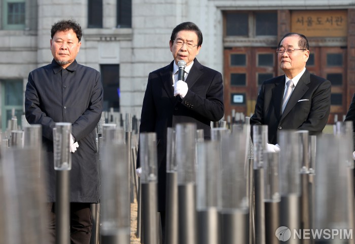 [서울=뉴스핌] 정일구 기자 = 박원순 서울시장이 2일 오전 서울 중구 서울광장에서 3.1운동 100주년을 맞아 열린 '꽃을 기다립니다' 추모전시에서 인사말을 하고 있다. 2019.03.02 mironj19@newspim.com