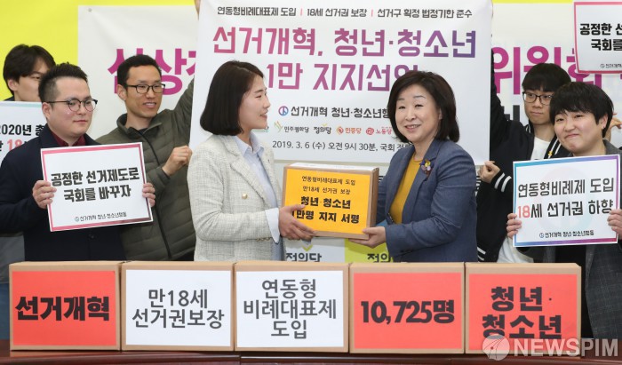 [서울=뉴스핌] 김학선 기자 = 선거개혁 청년·청소년행동 관계자들이 6일 국회에서 심상정 국회 정치개혁특별위원회 위원장에게 연동형비례대표제 도입 및 만18세 선거권 보장 청년·청소년 1만명 지지 서명서를 전달하고 있다. 2019.03.06 yooksa@newspim.com