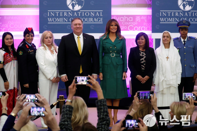 | [워싱턴 로이터=뉴스핌] 남혜경 인턴기자 = 7일(현지시간) 미국 국무부에서 열린 올해의 '국제 용기있는 여성(IWOC)상' 시상식에서 영부인 멜라니아 트럼프 여사(가운데 오른쪽)와 마이크 폼페이오 국무장관(가운데 왼쪽)이 수상자들과 함께 기념촬영을 하고 있다. 2019.03.07. |