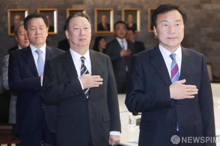 [서울=뉴스핌] 윤창빈 기자 = 손학규 바른미래당 대표(오른쪽부터),박용만 대한상공회의소 회장과 참석자들이 8일 오전 서울 중구 대한상공회의소에서 열린 바른미래당 경제현장 연속 정책간담회에서 국민의례를 하고 있다. 2019.03.08 pangbin@newspim.com