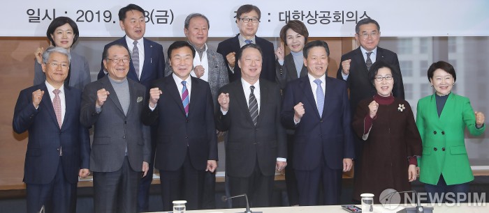 [서울=뉴스핌] 윤창빈 기자 = 손학규 바른미래당 대표(앞줄 왼쪽 세번째부터),박용만 대한상공회의소 회장과 참석자들이 8일 오전 서울 중구 대한상공회의소에서 열린 바른미래당 경제현장 연속 정책간담회에서 기념촬영을 하고 있다. 2019.03.08 pangbin@newspim.com