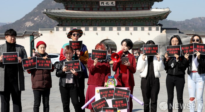 [서울=뉴스핌] 정일구 기자 = 8일 오후 서울 종로구 광화문광장에서 프로젝트팀 탈연애선언 '정상연애' 장례식 퍼포먼스가 진행되고 있다. 2019.03.08 mironj19@newspim.com