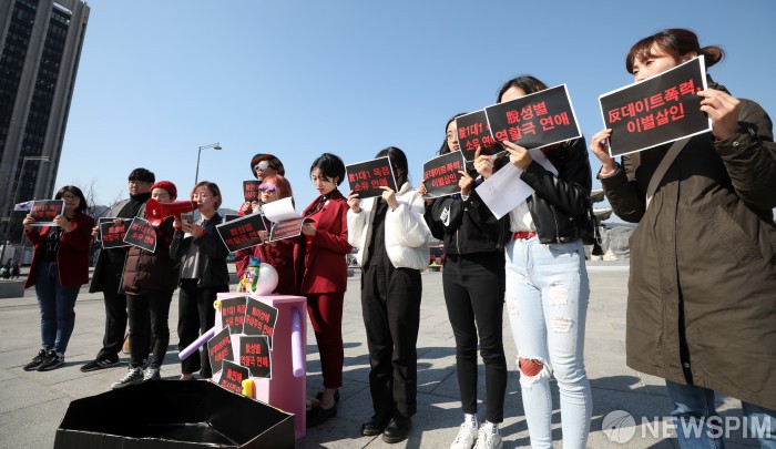 [서울=뉴스핌] 정일구 기자 = 8일 오후 서울 종로구 광화문광장에서 프로젝트팀 탈연애선언 '정상연애' 장례식 퍼포먼스가 진행되고 있다. 2019.03.08 mironj19@newspim.com
