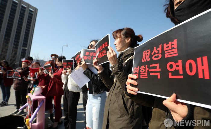 [서울=뉴스핌] 정일구 기자 = 8일 오후 서울 종로구 광화문광장에서 프로젝트팀 탈연애선언 '정상연애' 장례식 퍼포먼스가 진행되고 있다. 2019.03.08 mironj19@newspim.com