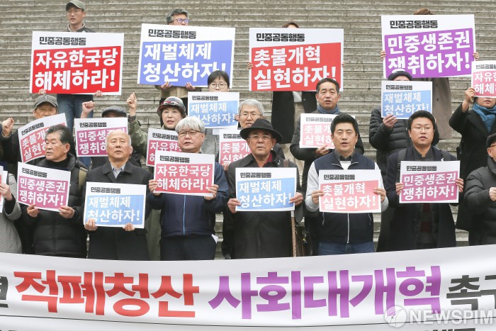 [서울=뉴스핌] 이형석 기자 = 12일 오후 서울 종로구 세종문화회관 앞에서 열린 민중공동행동 '박근혜 파면 2년, 적폐청산, 사회대개혁 촉구' 기자회견에서 참석자들이 구호를 외치고 있다. 2019.03.12 leehs@newspim.com
