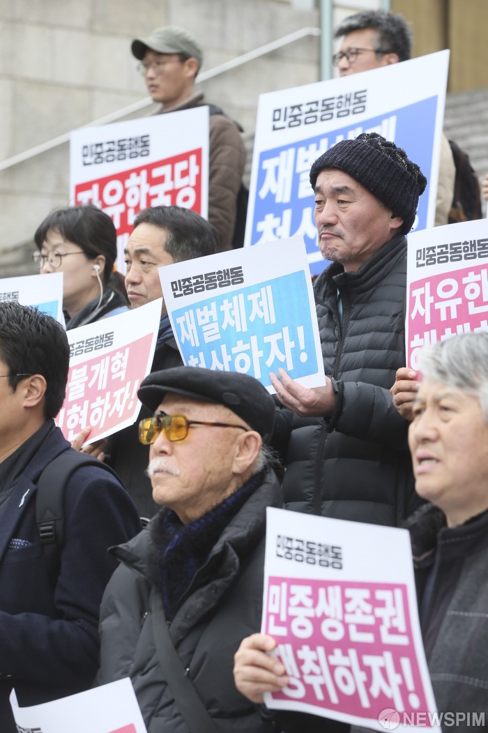 [서울=뉴스핌] 이형석 기자 = 12일 오후 서울 종로구 세종문화회관 앞에서 민중공동행동이 '박근혜 파면 2년, 적폐청산, 사회대개혁 촉구' 기자회견을 하고 있다. 2019.03.12 leehs@newspim.com