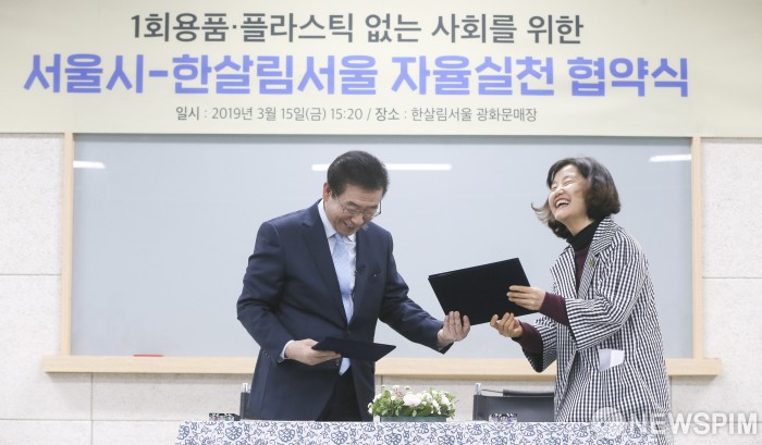 [서울=뉴스핌] 이형석 기자 = 박원순 서울시장(왼쪽)과 권옥자 한살림서울 이사장이 15일 오후 서울 종로구 한살림서울 광화문매장에서 열린 '1회용품‧플라스틱 없는 사회를 위한 서울시-한살림서울 자율실천 협약식‘에서 사인을 마치고 협약서를 교환하고 있다. 2019.03.15 leehs@newspim.com