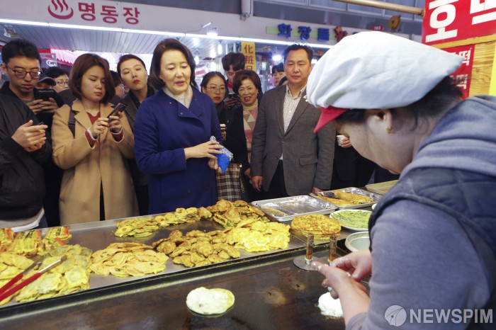 [서울=뉴스핌] 백인혁 인턴기자 = 박영선 중소기업벤처부 장관 후보자가 20일 오전 서울 구로구 남구로시장을 방문해 호떡을 구입하고 있다. 2019.03.20 dlsgur9757@newspim.com